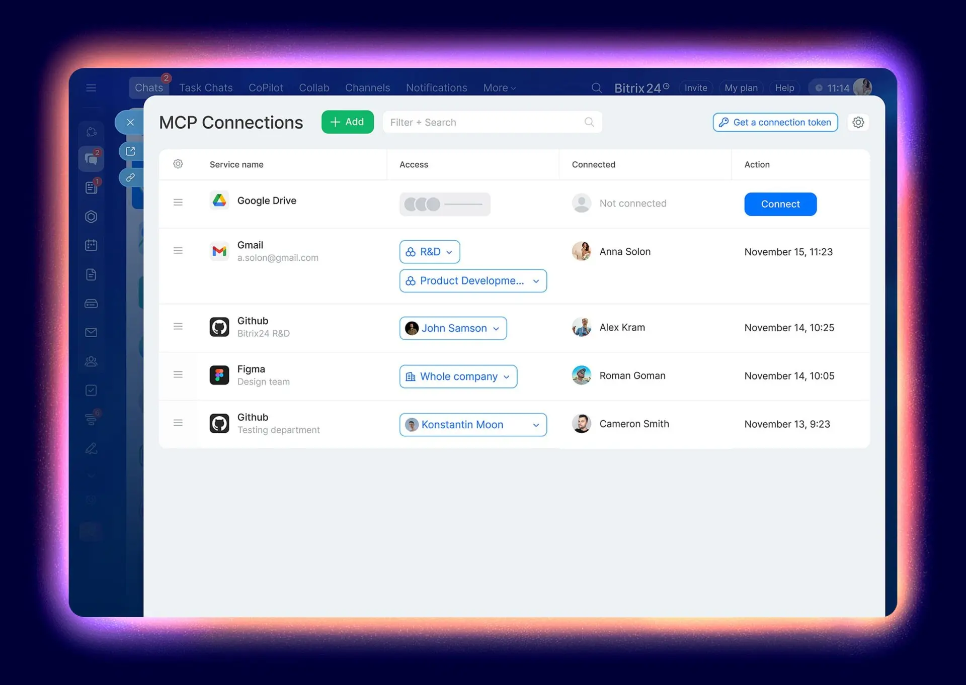Manage Bitrix24, Google, Figma, and more through a single intelligent center.